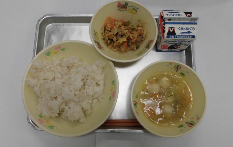 今日の給食は、麦ごはん、チンジャオロース、中華つくねスープ、牛乳です。