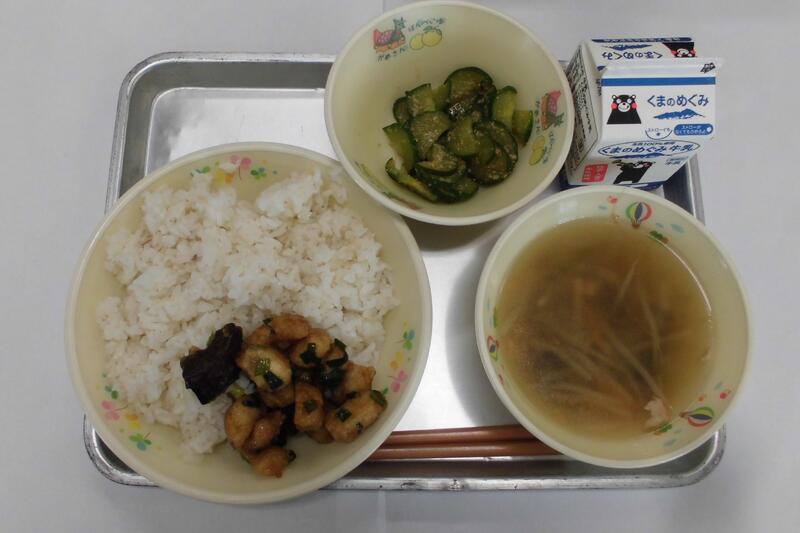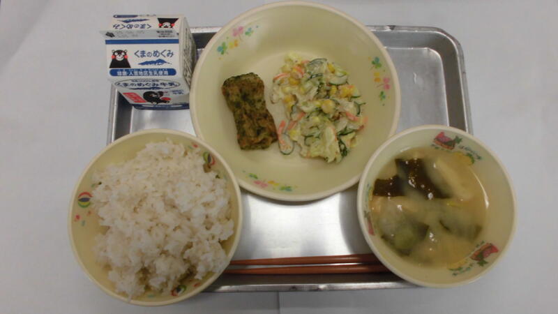今日の献立は、麦ごはん、黒皮かぼちゃのみそ汁、ちくわのお茶揚げ、マヨおかかあえ、牛乳です。
