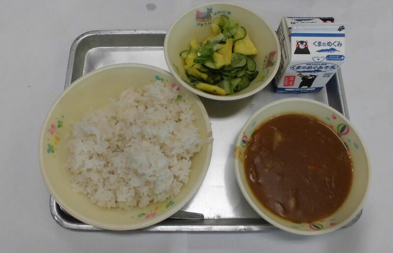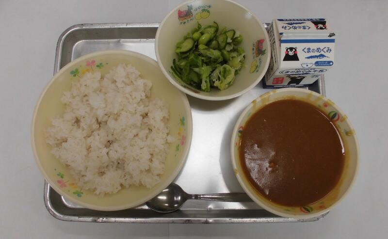 今日の献立は、ポークカレー、グリーンサラダ、牛乳です。