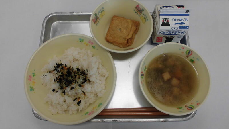 今日の献立は、セルフわかめご飯、信田煮、五目汁、牛乳です。