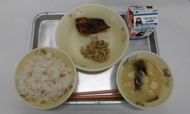今日の献立は、麦ごはん、魚のにんにく焼き、甘酢和え、みそ汁、牛乳です。