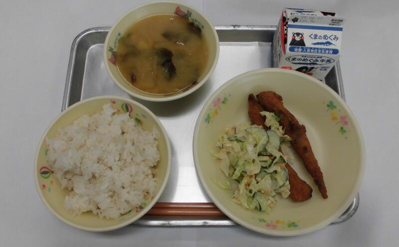 今日の給食は、麦ごはん、ししゃもフライ、かみかみあえ、みそ汁、牛乳です。
