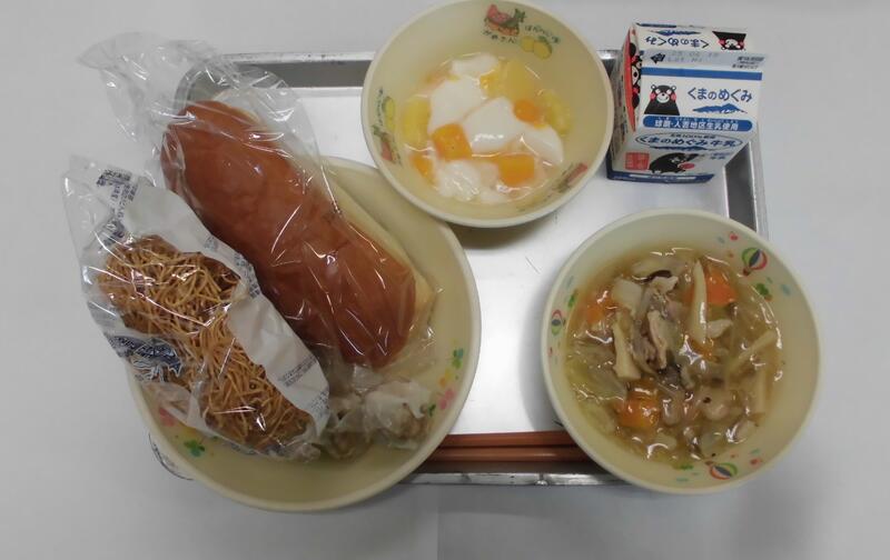 今日の給食の献立は、ミルクパン、焼きチャー麺、シュウマイ、杏仁豆腐、牛乳です。