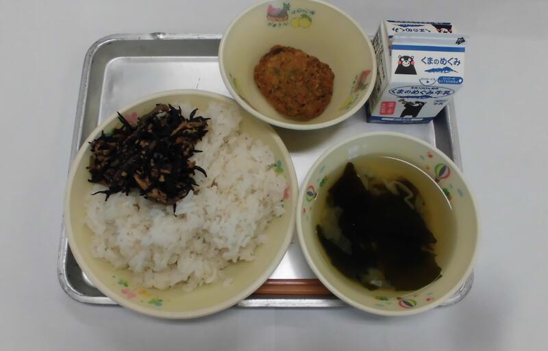 今日の献立は、セルフひじきごはん、メンチカツ、すまし汁、牛乳です。