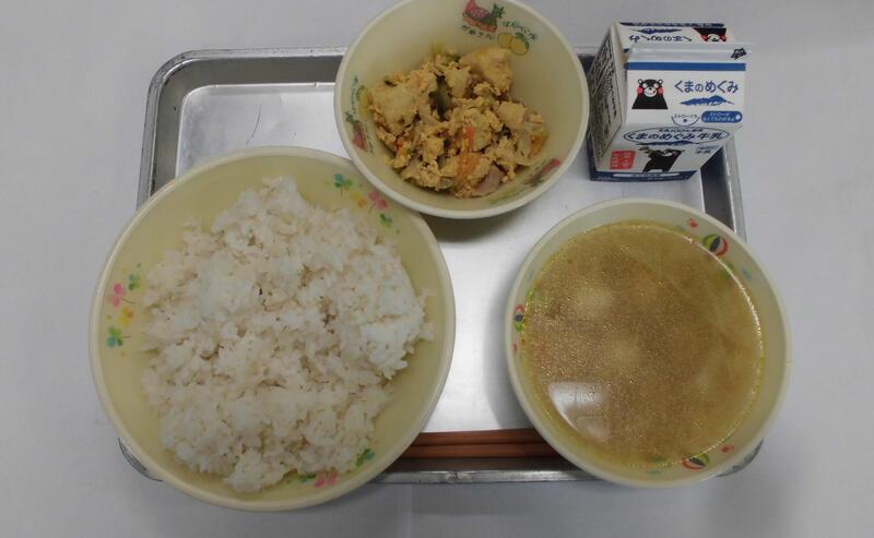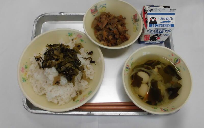 今日の献立は、麦ごはん、高菜の油炒め、豚肉とごぼうの煮物、うずらの卵のすまし汁、牛乳です。