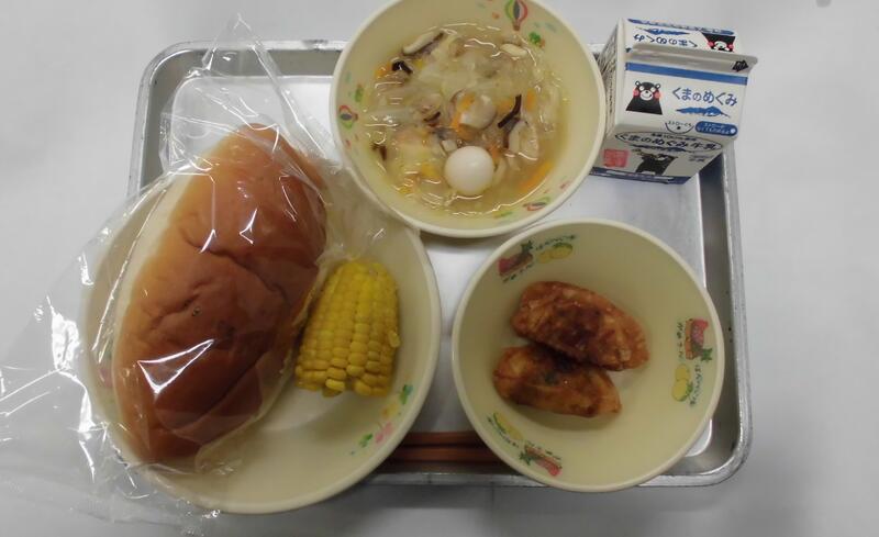 今日の献立は、ミルクパン、タイピーエン、ぎょうざ、とうもろこしの塩ゆで、牛乳です。
