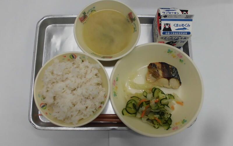今日の献立は、麦ごはん、さばの塩焼き、甘酢あえ、みそ汁、牛乳です。