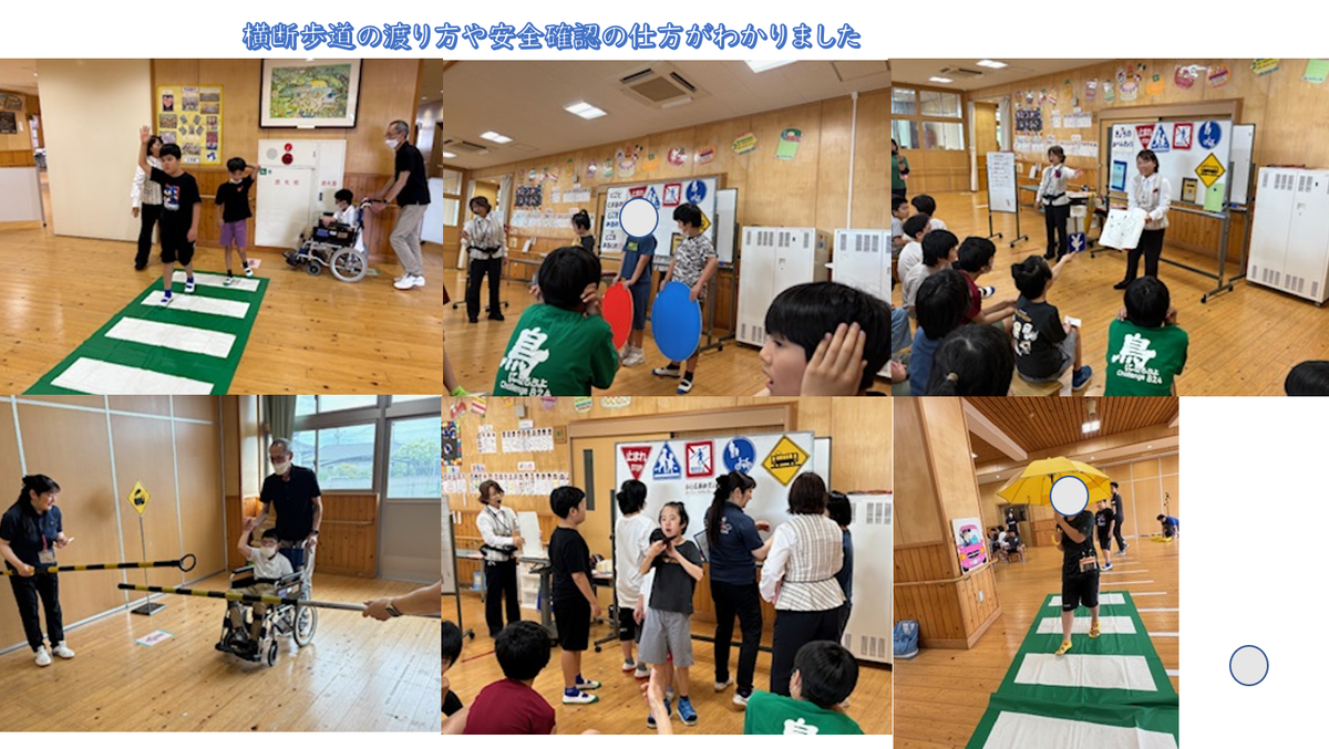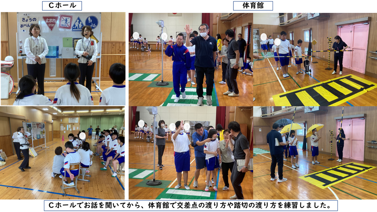 交通安全協会と市役所から4名の方に来ていただき昨日は1年生から3年生まで、本日は4年生から6年生までの交通教室がありました。安全な歩行の仕方や横断歩道の渡り方、安全確認の仕方などを教えていただき練習しました。
