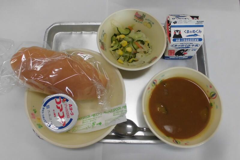 今日の献立は、コッペパン、スープカレー、フレンチサラダ、ヨーグルト、牛乳です。