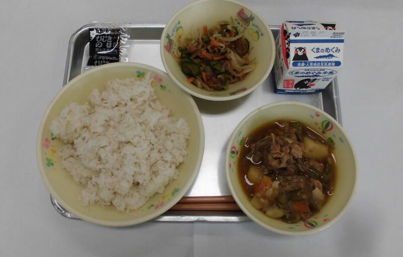 今日の献立は、麦ごはん、豚じゃが、梅肉あえ、一食焼きのり、牛乳です。