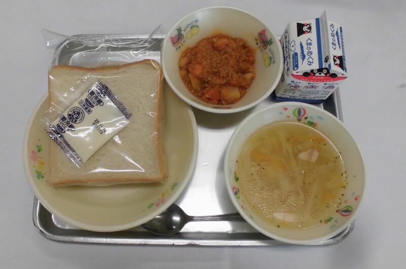 今日の給食は、食パン、ドライカレー、ラビオリスープ、メロン、牛乳です。