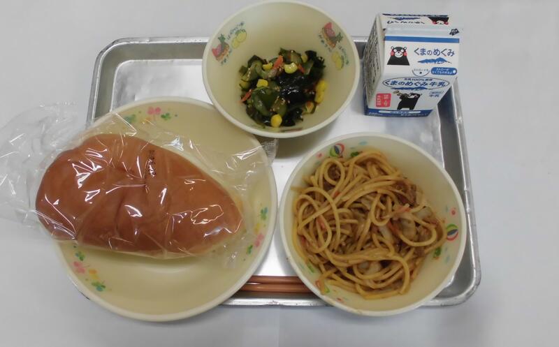 今日の献立は、ミルクパン、焼きそば、海藻サラダ、牛乳です。