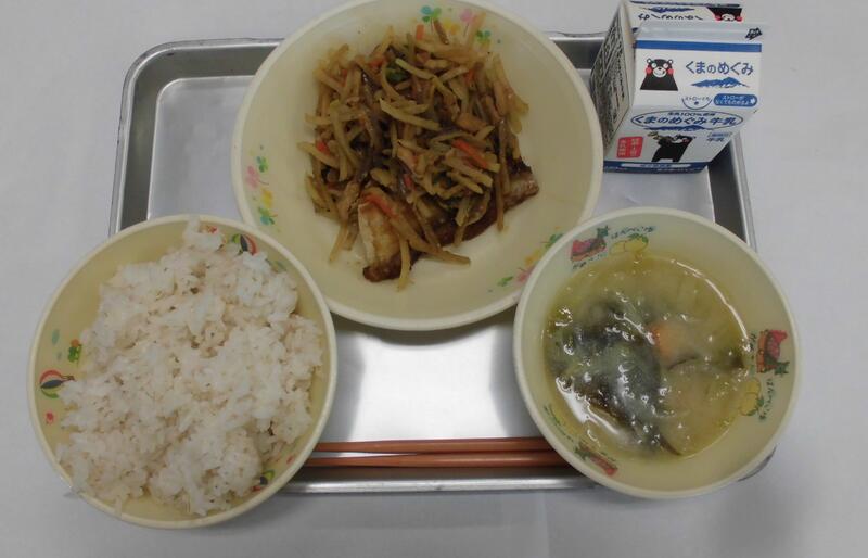 今日の献立は、麦ごはん、みそ汁、太刀魚のしょうがだれ、じゃがいものきんぴら、牛乳です。