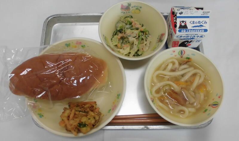 今日の献立は、ミルクパン、かきあげ、五目うどん、梅マヨあえ、牛乳です。