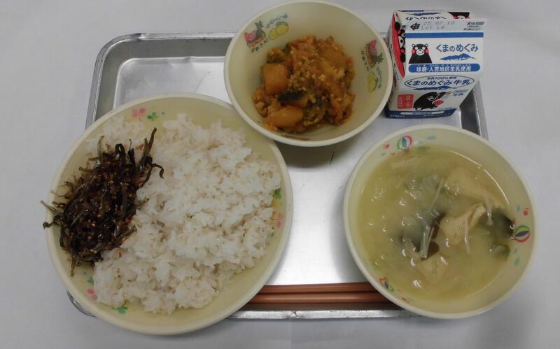 今日の献立は、麦ごはん、手作り佃煮、かぼちゃのそぼろ煮、みそ汁、牛乳です。