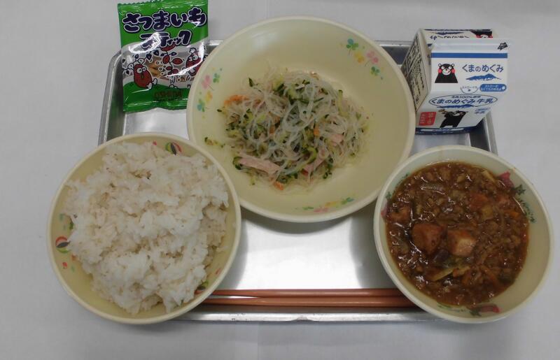 今日の献立は、麦ごはん、マーボーなす、バンサンスー、一食おさつスティック、牛乳です。