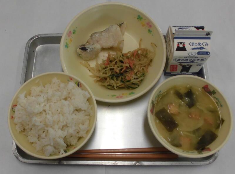 今日の給食は、麦ごはん、みそ汁、魚の塩こうじ焼き、ごまあえ、牛乳です。