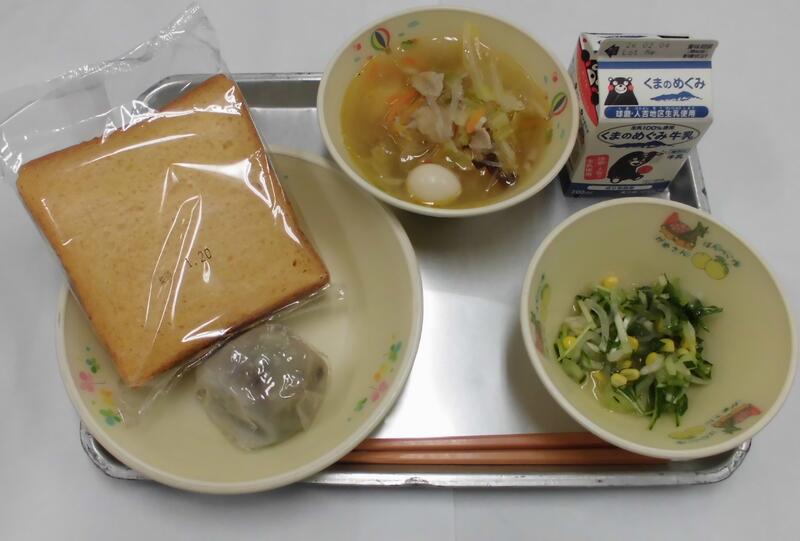 今日の献立は、トマトパン、タイピーエン、水菜のサラダ、いきなりだんご、牛乳です。