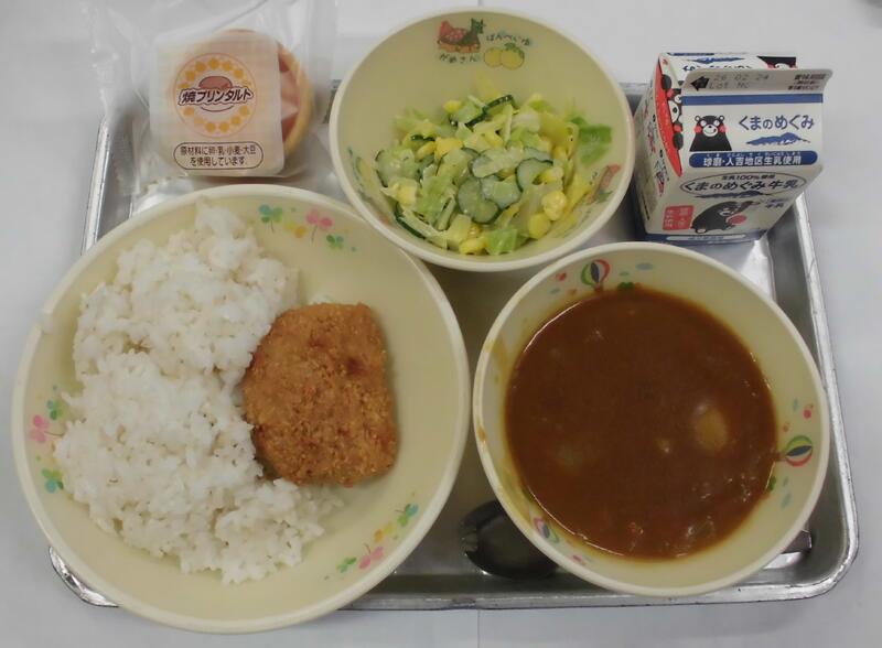 今日の給食は、カツカレーライス、シーザーサラダ、デザート、牛乳です。