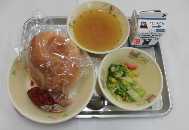 今日の給食は、パン、カバァリャ・コン・トマテ、スペイン風サラダ、ソパ・デ・アホ、牛乳です。