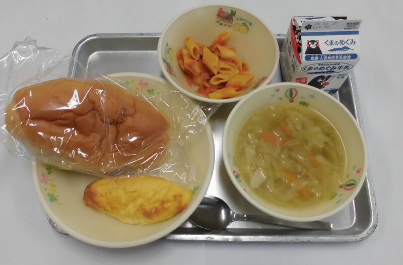 今日の献立は、ミルクパン、野菜スープ、冬トマトのペンネ、オムレツ、牛乳です。