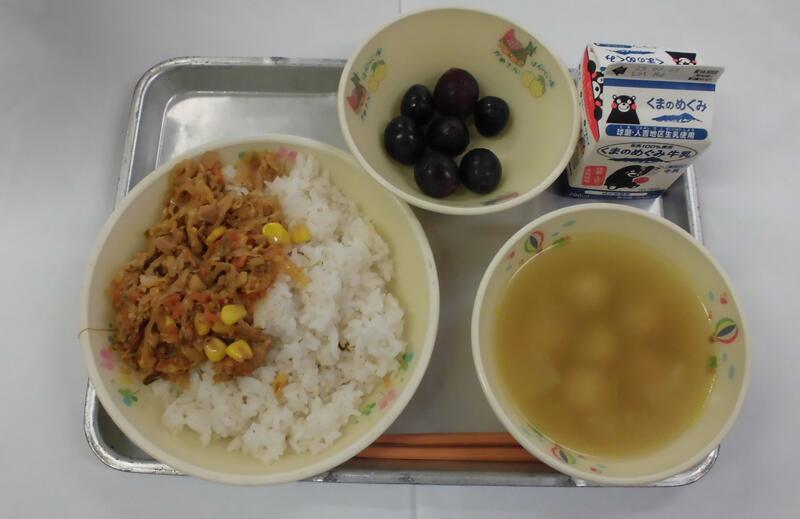 今日の献立は、麦ごはん、豚肉の生姜焼き、なすのみそ汁、梅肉和え、牛乳です。