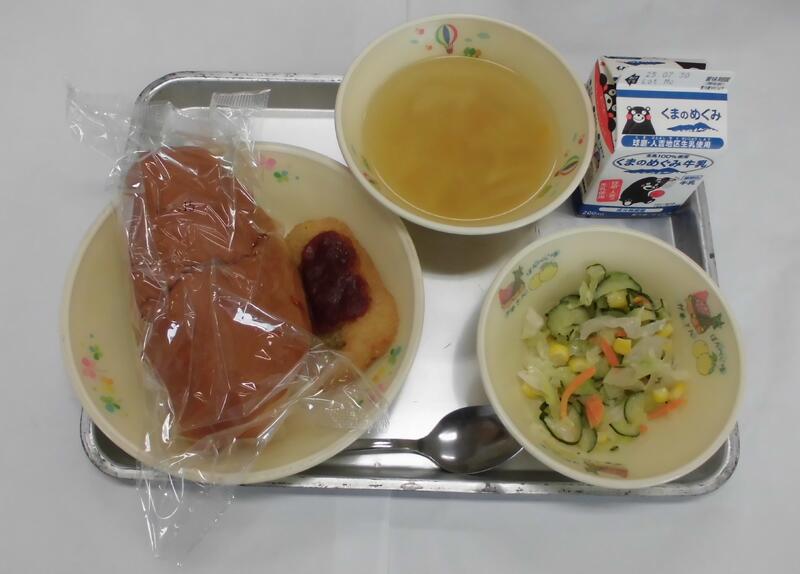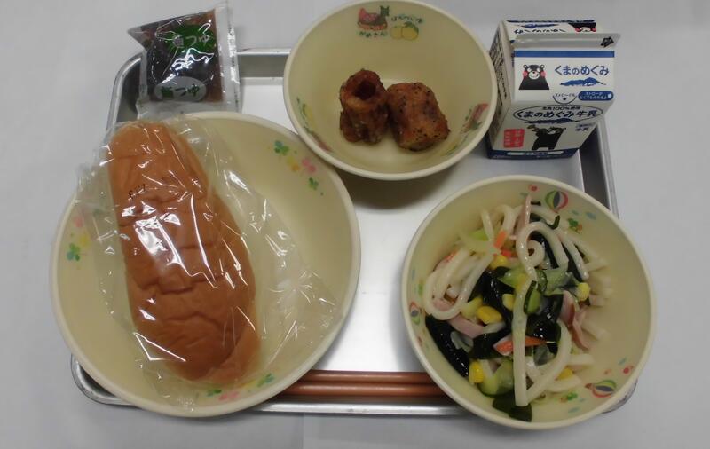 今日の献立は、ミルクパン、冷やしうどん、ちくわのゆかり揚げ、牛乳です。