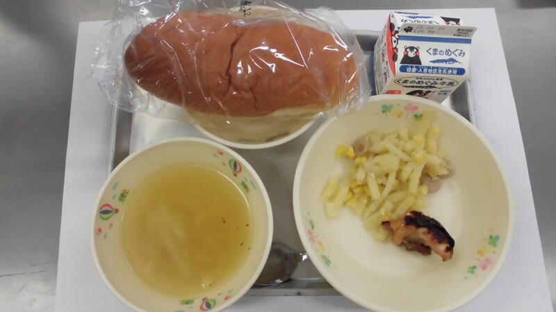 今日の献立は、ミルクパン、鶏肉のマーマレード焼、じゃがいものソテー、野菜スープ、牛乳です。