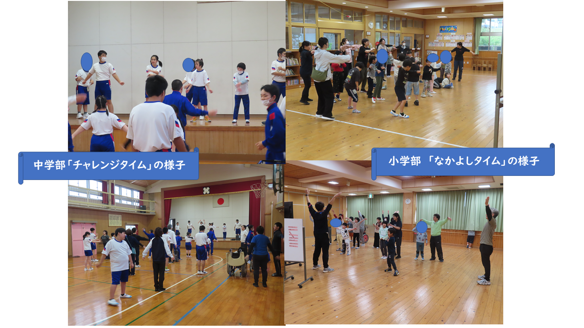 小学部「なかよしタイム」では、1.2.3年生と4.5.6年生に分かれて、運動会で踊るダンスの練習をしたり、学期毎に題材を決めて楽しく体を動かしたりしています。1学期の題材は「リズムに合わせて体を動かそう」です。