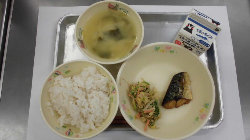 今日の献立は、麦ごはん、豆腐のみそ汁、さばの塩焼き、春キャベツのごまあえ、牛乳です。