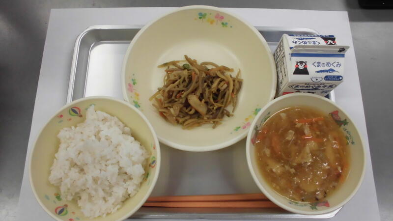 今日の献立は、セルフ南関あげ丼、たけのこのきんぴら、牛乳です。