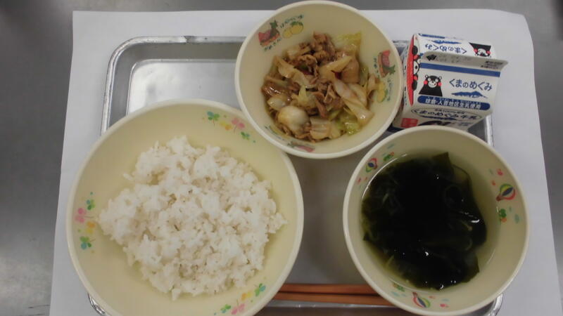 今日の献立は、麦ごはん、ホイコーロー、わかめスープ、牛乳です。