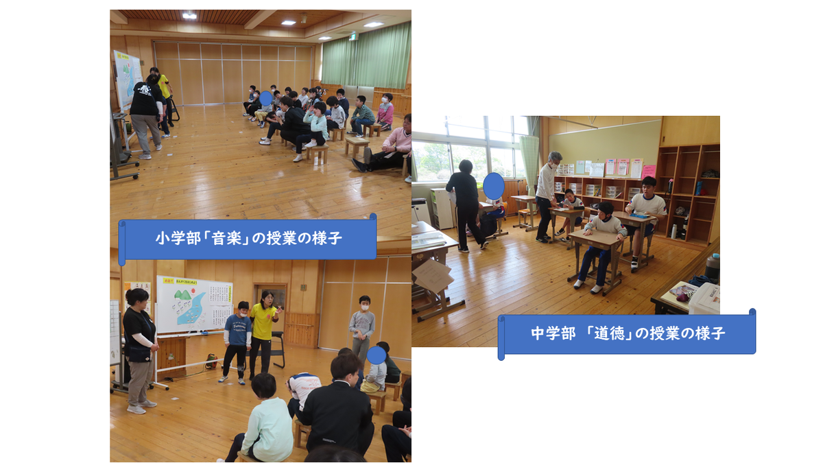 小学部の「音楽」の授業では、下学年(1.2.3年生)と上学年(4.5.6年生)に分かれて、それぞれAホール、Bホールで学習をしています。上学年の授業では「春の小川」を歌ったり、ホワイトボードに貼られた絵から小川にいる生き物を想像して発表したりしていました。中学部の「道徳」の「なかよくなろう」の学習では、学校生活が楽しく充実したものになるように、自分たちで仲良くなるためにできることは何かをみんなで考えていました。