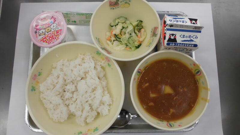 今日の献立は、チキンカレーライス、コールスローサラダ、お祝いデザート、牛乳です。