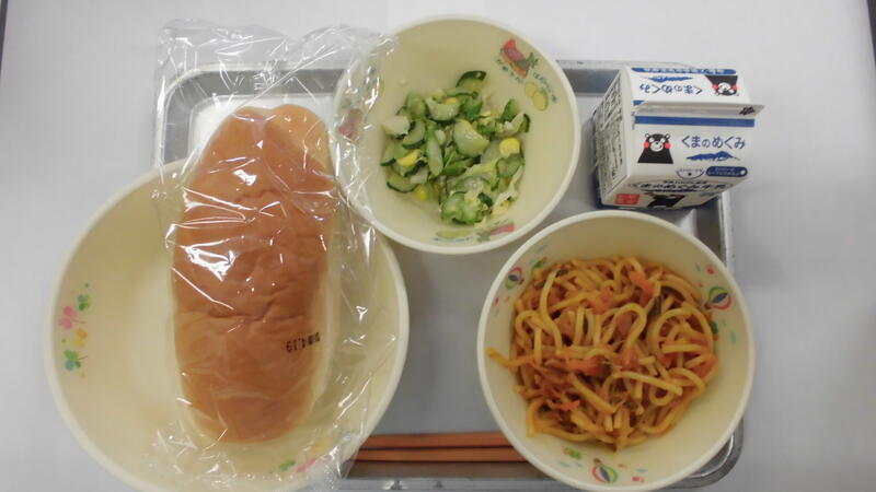 今日の献立は、ミルクパン、スパゲティナポリタン、アスパラガスのサラダ、牛乳です。