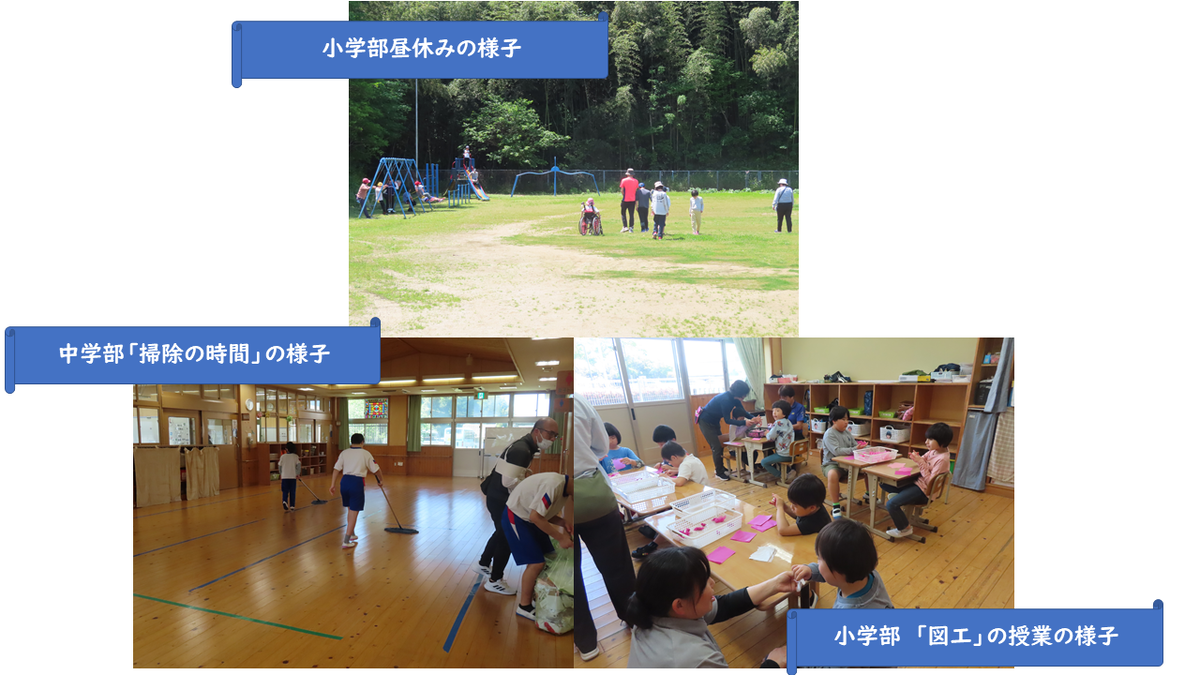本日より15時下校の通常日課になりました。中学部では「清掃活動」の時間に2階の教室、ホール、職員室などの掃除を頑張っています。小学部5.6年生の子供たちは、今日から始まった昼休みの時間に、運動場に出て遊具で遊んだり、走り回ったりと元気に活動していました。午後からの授業では、小学部3.4年生の子供たちが「図工」の学習で掲示板の飾りづくりの活動をしていました。
