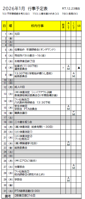 ※あくまでも予定ですので変更になる場合があります。 R7.12月行事予定表【12月】.pdf R7.11月行事予定表【11月】.pdf R7.10月行事予定表【10月】.pdf R7.9月行事予定表【9月】.pdf R7.8月行事予定表【8月】.pdf R7.7月行事予定表【7月】.pdf R7.6月行事予定表【6月】.pdf R7.学校行事予定表【5月】.pdf R7.学校行事予定表【4月】.pdf