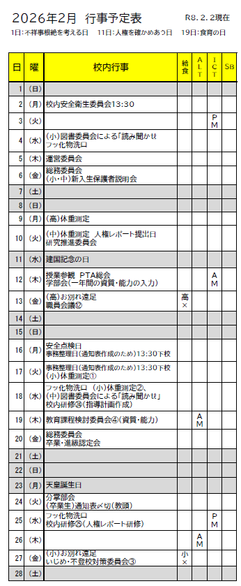 ※あくまでも予定ですので変更になる場合があります。 R7.1月行事予定表(掲示用決定)【八代支援学校】.pdf R7.12月行事予定表【12月】.pdf R7.11月行事予定表【11月】.pdf R7.10月行事予定表【10月】.pdf R7.9月行事予定表【9月】.pdf R7.8月行事予定表【8月】.pdf R7.7月行事予定表【7月】.pdf R7.6月行事予定表【6月】.pdf R7.学校行事予定表【5月】.pdf R7.学校行事予定表【4月】.pdf