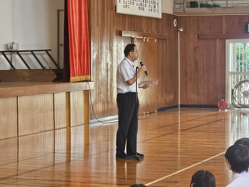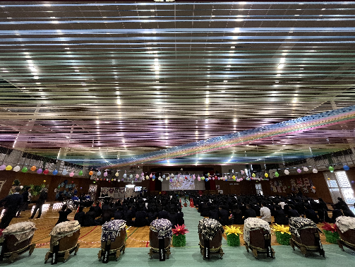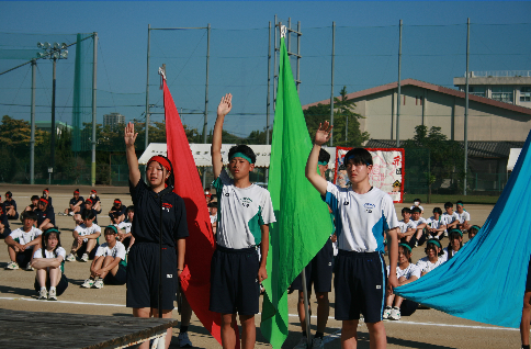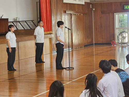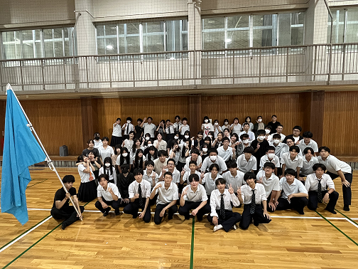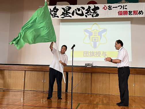 令和7年9月17日(水)本校体育館で体育大会結団式が行われました。今年は、緑団団長杉本純真さん、青団団長田原毅さん、赤団団長西村佑椛さんの3名が中心となり体育大会を盛り上げていく事になりました。水野校長先生より、体育会で団結したくさんの思い出を作り、楽しんで欲しいというお話しを頂きました。団旗授与後、各団それぞれで決起集会を行い、いよいよ体育大会に向けて頑張る雰囲気になってきました。