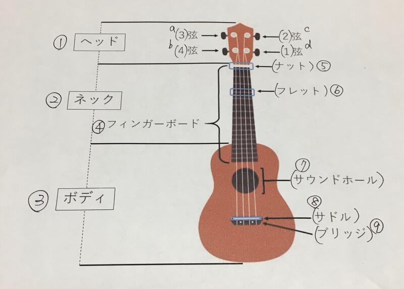 現在の授業は、ウクレレについて学習しています。ウクレレの構造について①~⑨、a~dの名称を覚えましょう。