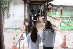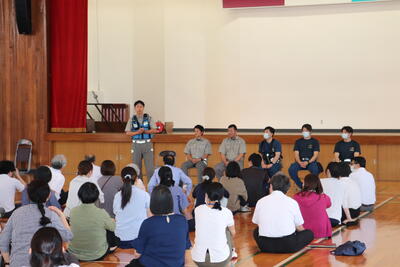 また、3課程合同の防災避難訓練も併せて実施しました。始めは緊急地震速報による一時避難、次に校内での出火による二次避難、今回は体育館への避難でしたが大変落ち着いて避難ができ、点呼後は中央消防署出水出張所より、講評をいただきました。