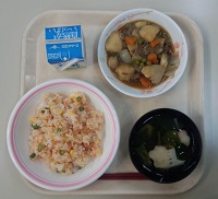今日のメニューは、毎年恒例のカレーライス。しかし、今年は辛口!生徒は「辛い、辛い」と言いながらも、美味しそうに食べていました。