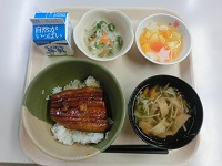 | | 今日は、鰻丼です。 給食に鰻丼をいただける。・・・なんと素晴らしい。香ばしいたれが食欲をそそります。周囲の方々も『おいしい』『おいしいね』と言ってましたよ。 土用の丑の日にはちょっと早めですが みなさん、スタミナをつけて元気にこの夏を乗り切りましょう! 明日の七夕にちなんで、デザートは寒天のキラキラ星がいっぱいです。 給食の先生、いつも素敵な夕ご飯、ありがとうございます。 |