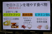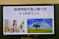 自律神経がよろこぶ①よく噛む②腹八分目③決まった時間④寝る直前食事を避ける、の4つの食べ方とセロトニン(しあわせホルモン)を増やす食べ物の紹介等がありました。