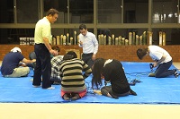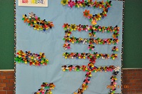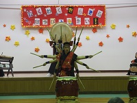 熊本支援学校の「第3回ゆうし祭」で初めて演奏しました。ホームページの太鼓部の活躍をご覧になり声をかけていただきました。あいにくの小雨でしたが、支援学校の体育館で「鼓響」と「舞湧伝」の2曲を演奏しました。部員の一人は足首を痛め、もう一人は曲の準備の間に滑って腰を打撲しましたが、最後まで精いっぱいの演奏で、盛大な拍手をいただきました。