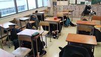 スモール訓練・・・緊急地震速報後に、机の下に隠れる1次避難と