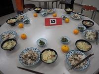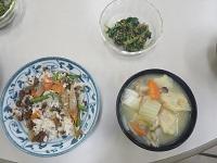11月13日(水)、地域の方々を招いて合同調理を行いました。今回の献立は、「だご汁、具飯、青菜のごまあえ」です。