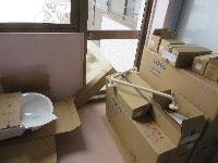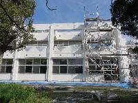 情報棟の外壁塗装及び防水工事はほぼ終わり、足場の解体が行われています。東棟のトイレ改修工事もいよいよ佳境にはいりました。