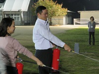 消防署員からの助言では「訓練は失敗があってもいい。失敗により課題が見つかる。想定内(設定された)の訓練でなく、実践に近い避難訓練だからこそ課題は明確になります。」との言葉をいただきました。その後、消火器の取扱説明、訓練用消火器での消火訓練を実践しました。