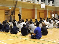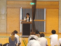 生徒集会では、副校長が「金曜に生活体験発表会がありましたが、聞く態度は良かったと思います。相手の立場にたって聞くことも大事ですが、人前で話をすることも大変意味のあることです。次年度以降は発表をすることも経験してほしいと思います。一生懸命になったことはその後の人生を支えます。この夏休中、それぞれが一生懸命頑張って次につながるような生活をしてほしい、皆元気な姿で月に会いましょう。」と訓辞されました。